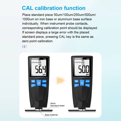 Custom Calibration: Place the standard 50μm/100μm/250μm/500μm/1000μm individually on the surface of the iron or aluminium substrate, the corresponding calibration point should be displayed when the instrument probe is in contact, if the screen shows a large error with the placed standard, press CAL in the same way as zero-calibration.