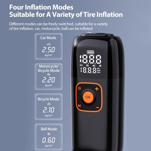 【4-in-1 Inflation Mode】The air pump has four preset inflation modes: car mode, motorcycle/bicycle mode, bicycle mode and ball mode, can freely switch between different modes.
