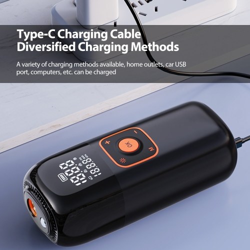 【Portable Tire Inflator】The portable air compressor offers maximum pressure of 150PSI and air flow of 30L/Min. It has built-in 6000mAh rechargeable batteries to meet your emergency inflation needs.