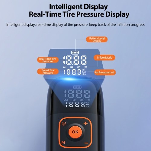 【Dual Screen Display, Automatic Shut-Off】The large screen accurately displays the real-time tire pressure and preset tire pressure. The air compressor automatically shuts off when the preset pressure is reached (to ensure that the pressure you set is higher than the current tire pressure), so there is no need to worry about over-inflation. There are 4 pressure measurement units (PSI, Kpa, Bar, and kg/cm²).