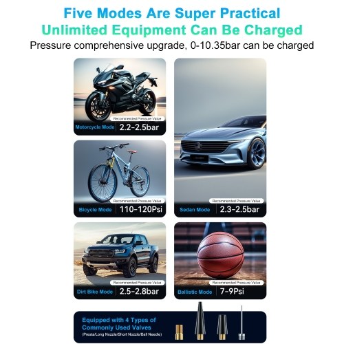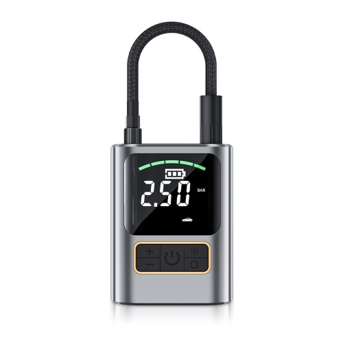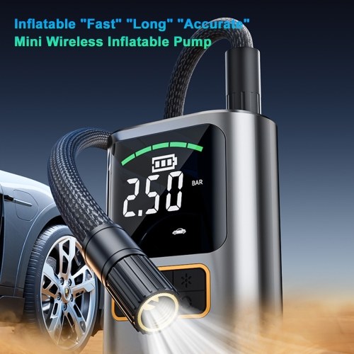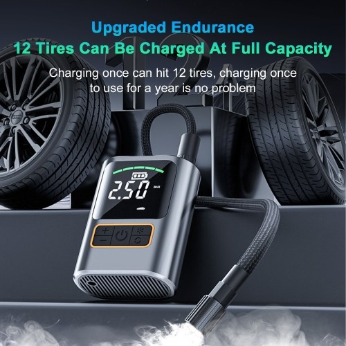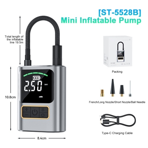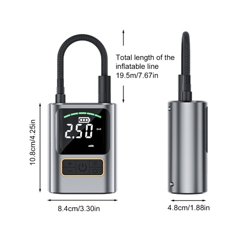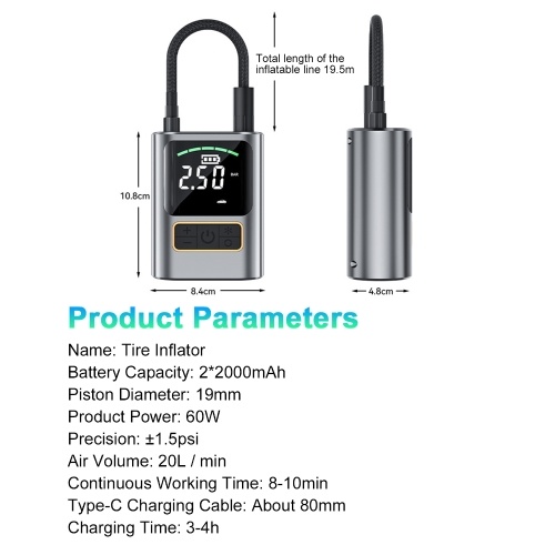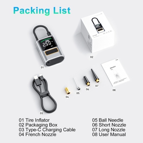 All in One Tire Inflator: The tire inflation machine adopts a compact lightweight design. The package comprises 1* Car Tire Inflator, 1* Air Hose, 4* extra nozzles, 1* USB-C Charging Cable, and 1* User Manual.