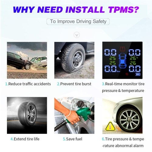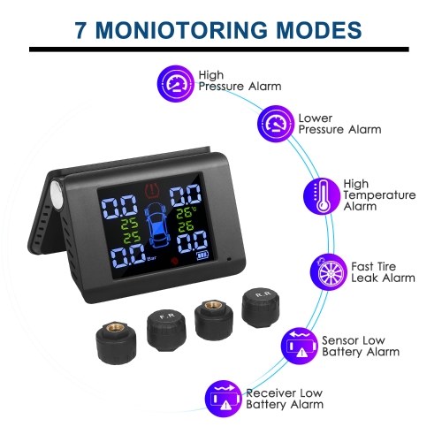 7 Types Alarm -- Our Tire Pressure Monitoring System provides 7 alarm modes, including fast leak alarm, high/low-pressure alarm, high-temperature alarm, sensor low voltage alarm, and sensor fault alarm and display low power alarm.