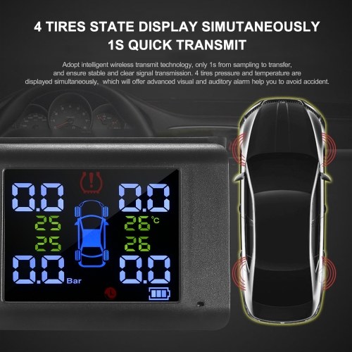 Full-Color Screen Real-Time Monitoring -- Ultra compact size designed with a large full-color high definition screen to monitoring 4 tires simultaneously, displays the tire pressure and temperature in real-time and provides visual and audible alarms when abnormal conditions occur.