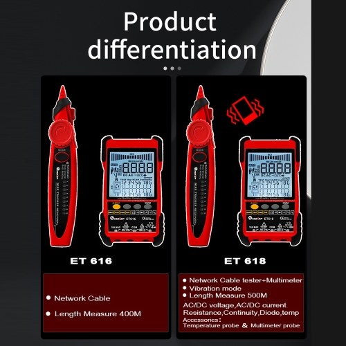 ET616/ET618 Optional: There are two different types for you to choose. The network cable length measuring ranges of ET616 is 400M, and the ranges of ET618 is 500M. Only ET618 has the multimeter functions.