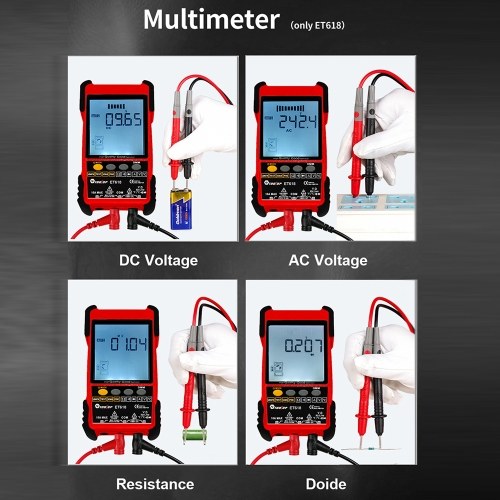 Multimeter Function: This function includes direct current and AC voltage and current measurement, resistance, continuity, diode, temperature measurement(Only ET618).