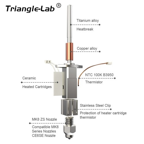 It is compatible with the MK8 series of nozzles, which are already available on the market with various functions. (such ashardened steel, diamond, tungsten carbide, or high-flow series, etc.),it reducing the nozzle costs in life-cycle.