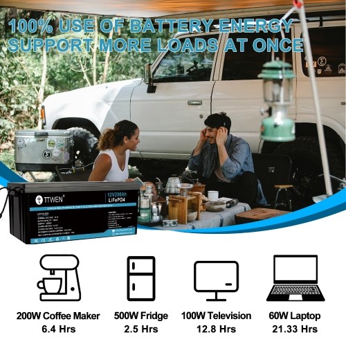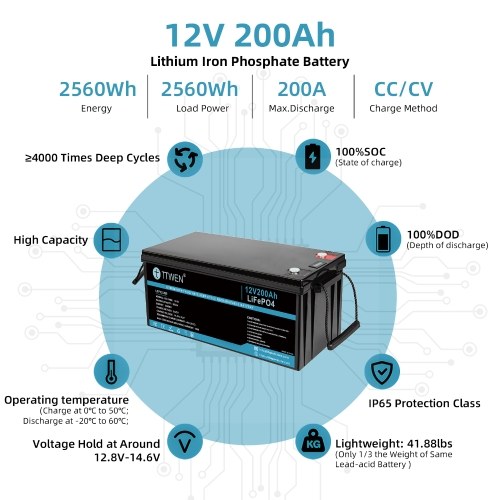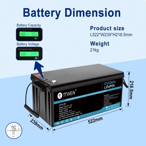 TTWEN 12V 200Ah batteries are manufactured by Automotive Grade LiFePO4 Cells with higher energy density, more stable performance, and greater power. With no acid in the battery, you're able to safely mount it in any position. LiFePO4 batteries can be recycled and do not produce elements that are harmful to the environment, but lead-acid batteries pollute the environment.