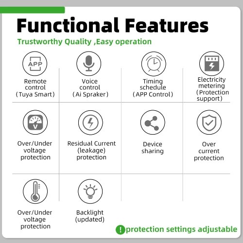 Premium Material: The housing is made of flameresistant material, built-in intelligent tuya chips, wear resistance, interference resistance, high strength and with fine durability. Physical button design, the threshold values can be customized as needed, sensitive operation and comfortable hand feeling.