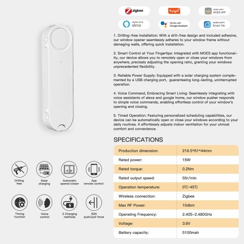 Voice commands: Compatible with Alexa and Google Assistant, intelligent control of window pusher with simple voice commands.