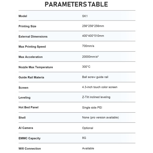 Reliable Printing Quality - XYZ-axes Linear motion guide design and ball bearing guide rail allow SK1 works more stable and precise to print. Along with support automatic calibration, you can get both high-speed printing and fine quality at the same time. 254x254x254mm/10x10x10inches build volume.