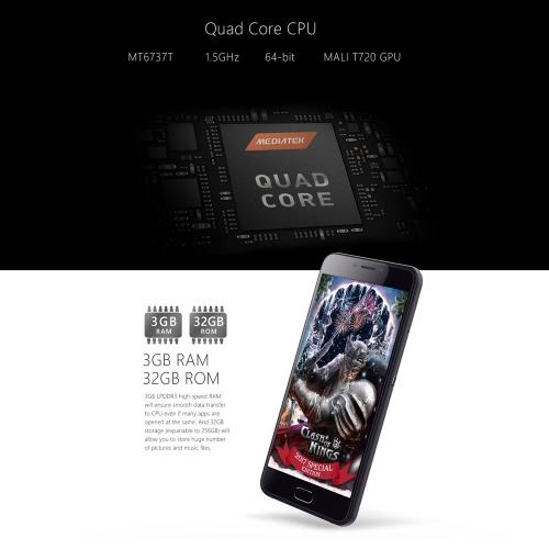 CPU and Storage: MTK6737T 1.5GHz 64-bit Quad Core, 3GB RAM+32GB ROM, high efficiency of data processing.