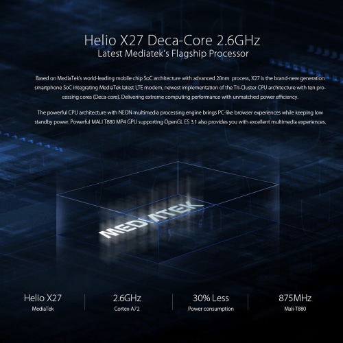 | CPU | MTK Helio X27, Deca-core, 2.6Ghz |
