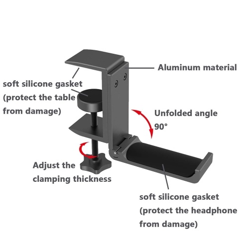 Solid and Safe Headphone Desk Holder: made of high-quality aluminum alloy, durable and sturdy, strong enough to hang heavy headphone; and the arm of the holder is with soft silicon gasket to protect your headphone from damage, super safe and reliable.