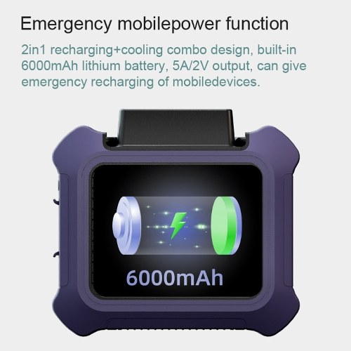 Emergency mobilepower function: 2in1 recharging+cooling combo design, built-in 6000mAh lithium battery, 5A/2V output, can give emergency recharging of mobiledevices.