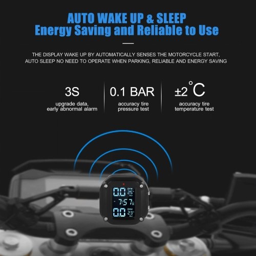 Upgrade Sports Motorcycle TPMS Tire Pressure Monitor -- Enlarged pressure monitor range: 0-8 Bar; More precision temperature (±2℃) and pressure (0.1Bar) monitoring, real time monitoring dual tires in simultaneously, Upgrade data every 3s, visual and sound warning synchronously, improve fuel efficiency, prolong tire life, ensures the safety driving.
