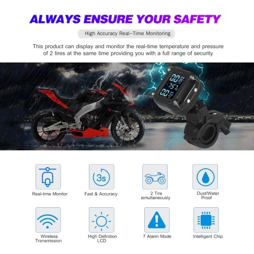 Upgrade Sports Motorcycle TPMS Tire Pressure Monitor more durable, anti-drop and waterproof below 60M, it is mainly used to monitor the pressure and temperature of tires automatically during the driving, and provide early alert for dangerous status, such as quick air leakage, low / high pressure, and high temperature, ensure safety driving.
