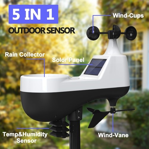 5-in-1 Outdoor Sensor: This compact outdoor sensor of the weather station integrates a wind vane, anemometer, rain gauge, temperature and humidity meter, and solar panel.