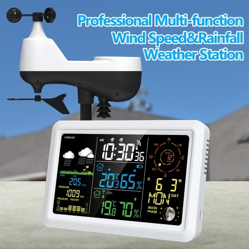 Multifunction Weather Station with Color Display: The weather stations color screen displays a wealth of weather information including indoor and outdoor temperature and humidity, weather forecast, calendar, week, moon phase, rainfall, air pressure, wind speed, wind direction, etc., and you can rely on its accuracy to make appropriate plans.