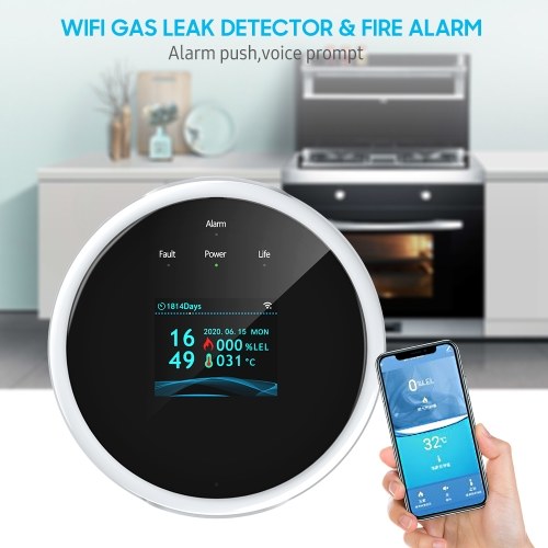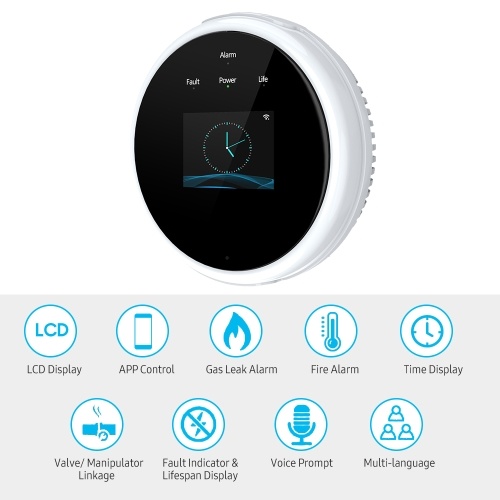 In case of gas leak, it alarms sound with voice prompt, pushes text notification to your mobile and drives the valve/ mainpulator to turn gas leak source off.