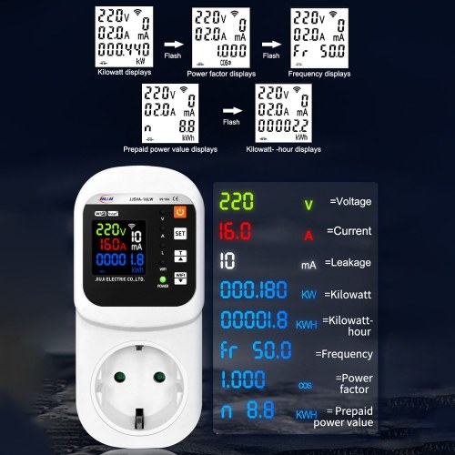 【Sturdy and Resilient】: When the fault voltage of the line reaches its peak, the product itself will not be damaged. The protector can display voltage, current, kilowatts, power factor, frequency, kilowatt-hours, and prepaid electricity.