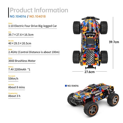 It adopts a 2.4G radio control system. With a high speed of 55km/h, you can enjoy the high-speed competition at the track or in your own backyard. This remote control car is a perfect toy to bring your kids to explore the field of automotive technology. It is a great gift to help your child's brain development. Anti explosion PVC color printing car shell, beautiful and collision resistant.