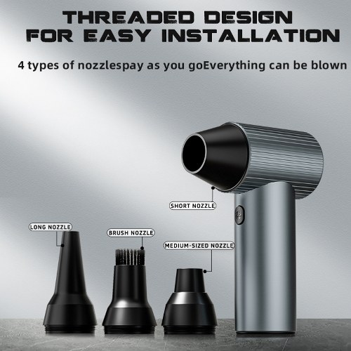 This jet fan is simple in design, reasonable in structure, and powerful in performance. Adopting a 40mm brushless motor, with 90,000RPM high rotation speeds can provide surging blowing power, generating an impressive 45 meters per second wind velocity, easy and convenient operation, with perfect dust removal effect, and ensuring high comfort and efficiency in various applications. Suitable for carbon fire blowing, industrial dust blowing, soot blowing, keyboard cleaning, car and motorcycle cleaning, car center console cleaning, car crevice cleaning, foot mat crumb cleaning, picnic garbage cleaning, air-cushions inflating, etc.