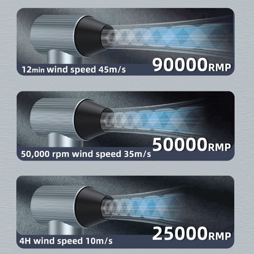 3 speeds adjustable: 1-gear windspeed 45m/s, 90,000RMP; 2-gear windspeed 35m/s 50,000rpm; 3-gear windspeed 10m/s, 25,000RMP