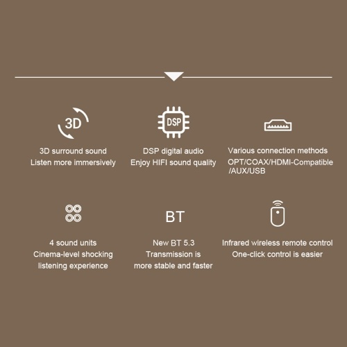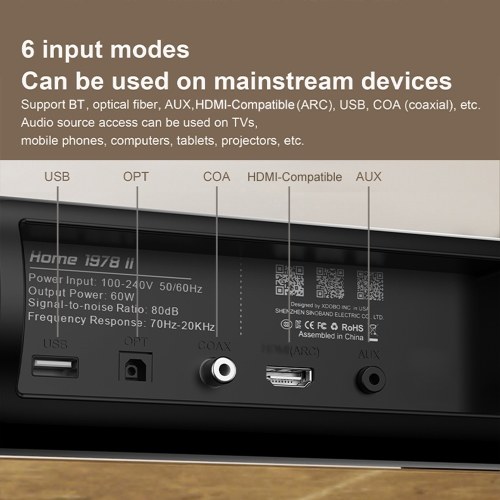 Multiple input modes: Supports BT, optical fiber, AUX, HDMI (ARC), USB, COA (coaxial), etc., audio source access can be used for TV, mobile phone, computer, tablet, projector, etc.
