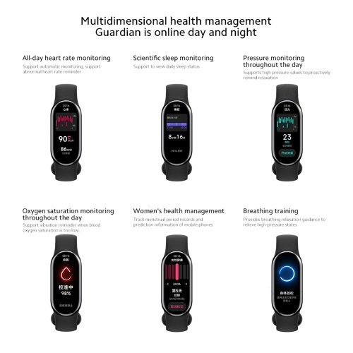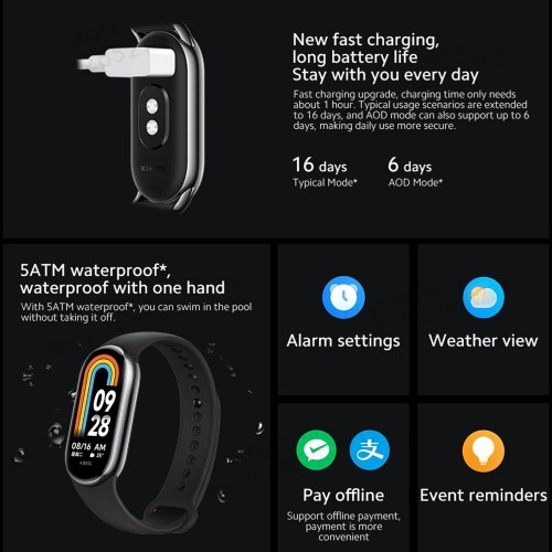 I am pleased with my Smart Bracelet. It records every step I take, measures heart rate, and can display notifications for messages on WhatsApp and incoming calls. It is versatile and can be worn on the neck or wrist. It is also waterproof up to 50 meters, allowing you to wear it while swimming. Additionally, it offers over 150 sports modes for activities both indoors and outdoors, including water sports, running, cycling, and yoga, enabling you to track your activity accurately and effectively. Despite having additional sensors and a larger screen, the Smart Band 8 boasts an impressive battery life of 16 days, which can be extended to 20 days with basic use. However, if used for daily training and parameter recording, the battery life may decrease to 9 days. I highly recommend it.
