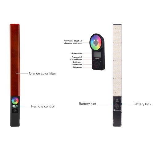 Really great affordable LED lights, very bright with a whole range of RGB colors and decent lighting effects. I’d recommend getting the version that’s 5600k only, not the Bi-color. It will be brighter and it comes with an ok CTO filter. If you need tungsten colors from it add a gel. Be sure to buy a battery, the 970s would get you a lot of use time, or a cable to plug it into the wall. And think about how you’re going to mount it, the 1/4 female screw is useful, but the wand is very long and I could see it breaking if too much pressure or force is applied to it i.e. somebody bumps into it on a light stand or some other force hits it. <ol cl