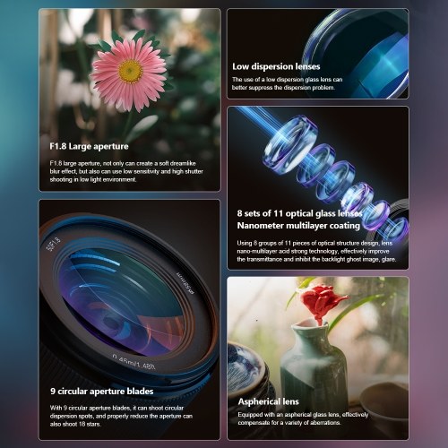 【F1.8 Bright Aperture】This lens features a bright and large F1.8 aperture, allowing more light into the lens for better low-light performance.