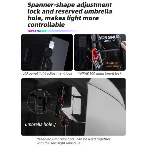 100W LED Video Light: With 528 pcs white light + 528 pcs warm light beads + 300 pcs RGB light beads , our LED video light panel supports 100W constant power output, 2000K-10000K wide color temperature range and various colorful lighting effects. And the precise 0.1%-100% dimming control knob allows for meticulous adjustments to match any different scenario.